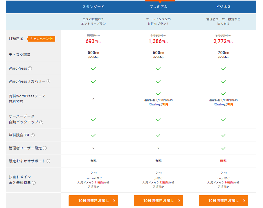 Xserverには複数のプランがありますが、個人ブログなら「スタンダード」プランで十分です。